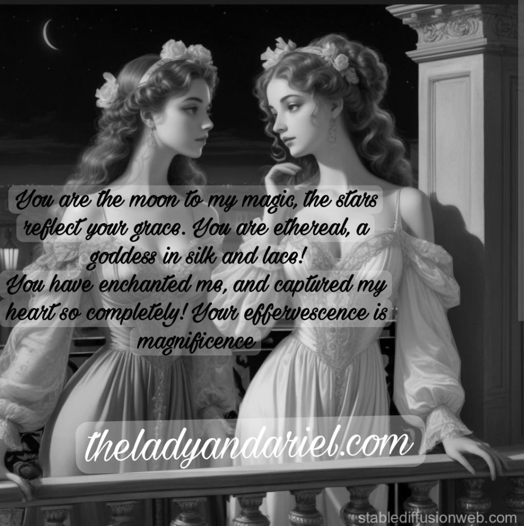 You are the moon to my magic, the stars reflect your grace. You are ethereal, a goddess in silk and lace!